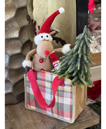 Arbre MINI de Nadal artificial amb base de funda de sac. Ideal per a decoració de taules de Nadal i complementar petits espais. Pensat per a aquelles llars és les que no hi ha gaire espai, o per a oficines i negocis. Decoració d'aparador de Nadal amb temàtica hivernal. Base rodona de fusta i sac arpillera.
