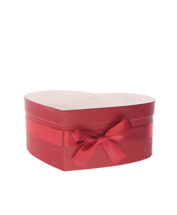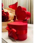 Descripció: Caixa barret amb forma de cor, tapa de color vermell i relleu de roses. Elegant Packaging per a flors, plantes, ram de núvia. Amb certificat FSC. Caixa Barret de Kraft amb cinta de cotó vermell.