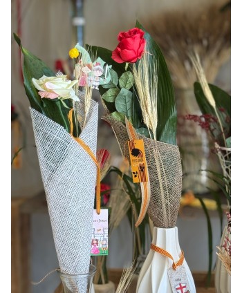 Descripció: Elegant con de jute natural en forma de corbata, ideal per a una rosa individual. El Packaging per a una tija està fabricat amb jute 100% natural. El disseny en jute fa aquest embolcall un packaging únic, original, elegant, exclusiu i 100% ecològic. Original Packaging per a una rosa. Complements de floristeria.