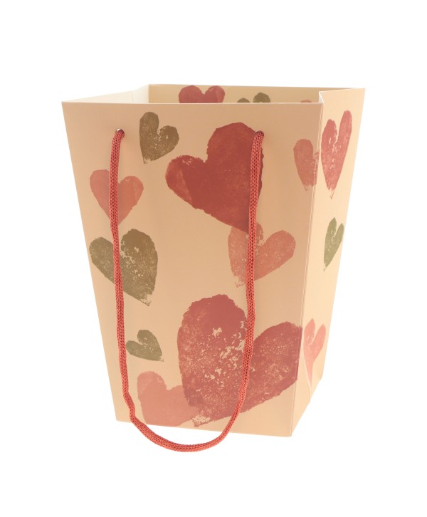 Descripció: Elegant Test per a plantes, es tracta d'una bossa de cartró rígid, amb disseny de cors vermells i nanses de cinta vermella. Amb certificat FSC.