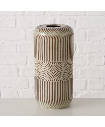 Gerro de porcellana setinada brillant en to lila i ratlles blanques amb tacte amb relleu. Gerro de gres brillant, fet a mà i resistent a l'aigua. Ideal per a les decoracions més originals de la teva floristeria. Proveïdor complements de decoració per a floristeria i decoració de la llar.