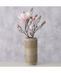 Gerro de porcellana setinada brillant en to lila i ratlles blanques amb tacte amb relleu. Gerro de gres brillant, fet a mà i resistent a l'aigua. Ideal per a les decoracions més originals de la teva floristeria. Proveïdor complements de decoració per a floristeria i decoració de la llar.