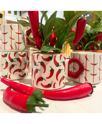 Descripció: Tassa de ceràmica CHILLY feta a mà amb nansa vermella, el fons blanc i decoració de ratlles vermelles i chillys. Ideal per a les decoracions més originals.