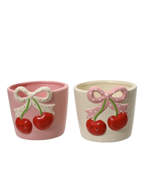 Originals tests de ceràmica fetes a mà, amb disseny de CIRERES i llaços amb puntets. Testos per a decoració de casaments, esdeveniments i composició floral. Testos de Floristeria.