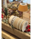 Cinta tèxtil crema amb decoració d'avets i puntets vermells i granats. Extrems reforçats. Cintes nadalenques d'alta qualitat per complementar els regals, plantes i flors a festes nadalenques.