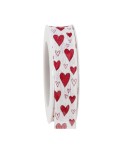 Descripció: Cinta de cotó blanca amb cors vermells. Extrems filats. Cintes d'enamorats per a decoració. Llaços de Sant Valentí tèxtils amb motius de cors. Cintes per complementar flors, plantes i regals.