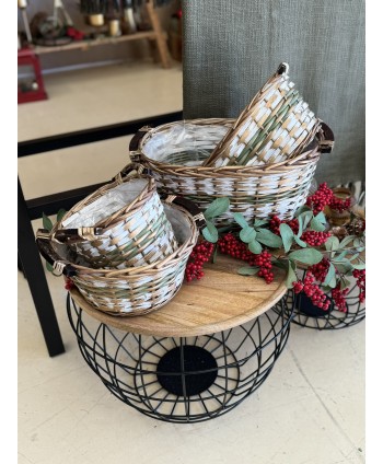 Descripció: Cistella rodona de vímet, en color marró natural i franja verda, amb nanses. Cistelles per a esdeveniments, casaments, floristeries i altres comerços de decoració. Proveïdor cistelles de vímet per a floristeria, flors, plantes, decoració.