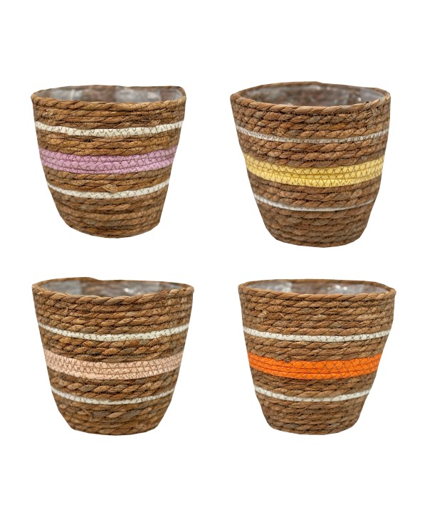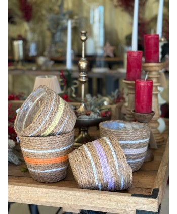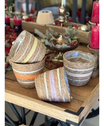 Cistella de jute natural amb franja de color. Set de 4 testos rodons de jute amb tres franges de color variat. Cistelles de floristeria. Ideal per a plantes, cistelles originals en fibra natural d'algues marines. Per testos ES17cm.