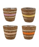 Descripció: Cistella de jute natural amb franja de color. Set de 4 testos rodons de jute amb tres franges de color variat. Cistelles de floristeria. Ideal per a plantes, cistelles originals en fibra natural d'algues marines. Per testos ES17cm.