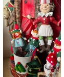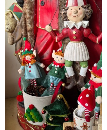 Penjoll tèxtil d'elf, amb vestit verd i gorra vermella amb cascavell. Cames a ratlles blanques i vermelles. Parella d'elf i elfa per penjar amb cinta d'organdí vermella. Figures XMAS per decorar. Originals Ninots gnom de Nadal, gorres de diferents colors.