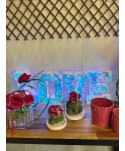 Lletres LOVE amb il·luminació LED ideal per a una decoració màgica. Disposa d'un cable amb terminació USB, no inclou l'endoll per connectar-lo a la corrent. La combinació perfecta en un sol producte, espectaculars Lletres LOVE i la llum incorporada per a les escenes més romàntiques. Decoració d'aparador pel dia d'enamorats.