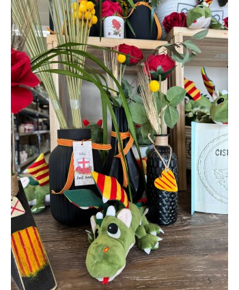 Descripció: Ampolla de vidre personalitzada a Cistelleria Pou per a la col·lecció de Sant Jordi. Ampolla pintada de negre, cordó de jute natural i un cor fet a mà amb argila i pintat amb la bandera catalana per a Sant Jordi.