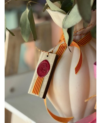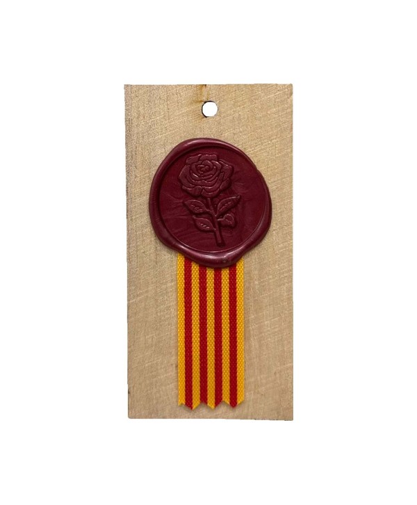 Etiqueta de fusta per penjar amb el segell de cera vermella de la rosa i cinta amb disseny de la bandera catalana i aragonesa a doble cara. Etiqueta original feta a mà! El color i les formes del segell i la cinta poden variar de la imatge, ja que han estat creades a Cistelleria Pou, una per una, de manera artesanal.