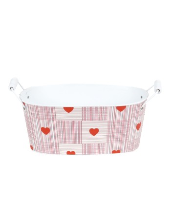 Cistella de zinc blanca amb cors en color vermell, quadres d'estil lineal i nanses. Ideal per a ocasions especials, Sant Valentí, Sant Jordi, dia de la mare. Proveïdors de complements per a floristeria i comerços de decoració. Proveïdors de cors de zinc.