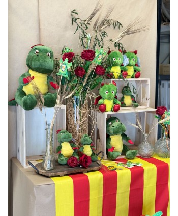 Drac de Peluix amb "BARRETINA" i ales de Señera. Set de dos dracs amb cor vermell i rosa vermella. Complements de decoració especial de la Diada de Sant Jordi. Original drac de Sant Jordi per complementar la rosa i el llibre. Ideal per decorar l´aparador de SANT JORDI, o bé per complementar les roses XXL. El Drac és el complement perfecte per decorar l'aparador per a la diada de Sant Jordi. Drac Decoratiu per a la Rosa de Sant Jordi. Drac de peluix petit, ideal pel dia de Sant Jordi. Drac de peluix preciós d´alta qualitat, per regalar amb la rosa vermella. Complementa la rosa.