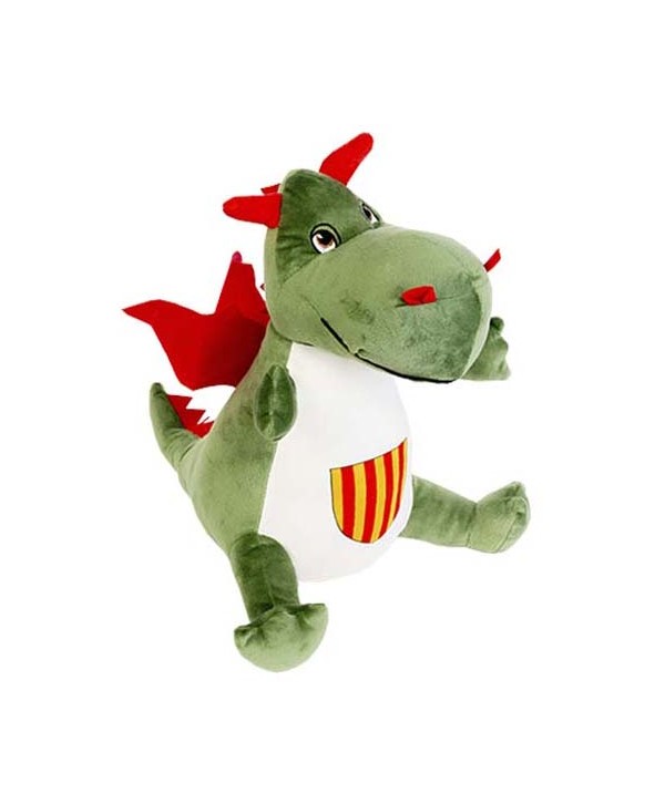 Drac de Peluix amb escut Senyera, ales i banyes vermelles. Complements de decoració especial de la Diada de Sant Jordi. Original drac de Sant Jordi per complementar la rosa i el llibre. Ideal per decorar l'aparador de SANT JORDI, o bé per complementar les roses XXL. El Drac és el complement perfecte per a decorar l'aparador per a la diada de Sant Jordi. Drac Decoratiu per la Rosa de Sant Jordi. Drac de peluix petit, ideal pel dia de Sant Jordi. Drac de peluix preciós d'alta qualitat, per regalar amb la rosa vermella. Complementa la rosa.