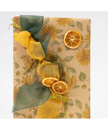 Descripció: Bobina de paper de regal KRAFT RECICLAT AMB DISSENY DE GIRASOLS. Embolcalls per a plantes, rams i regals. Proveïdors majoristes per al comerç i floristeria.