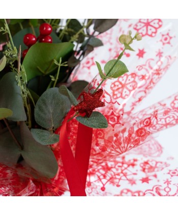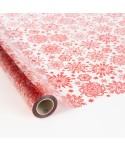 Descripció: Embolcall de cel·lofana polipropilè de Nadal, amb disseny de mandales i estrelles en color vermell i fons transparent. Embolcall per a flors plantes, regals, comerç. Proveïdor embolcalls de floristeria a l'engròs.