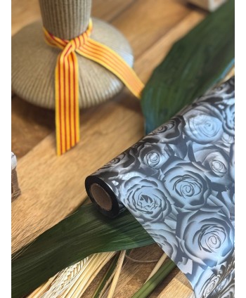 Paper de regal, flors i plantes amb disseny amb Roses precioses i fons glacejat. Embolcall per al dia de Sant Jordi. Embolcall per a la rosa vermella típica a Barcelona.