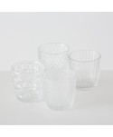 Descripció: Gots de vidre transparents gravats "VINTAGE", model MARILU, amb relleu. Proveïdors de complements per a floristeria i altres comerços de la decoració. Proveïdors d'articles per decorar la taula de Nadal.