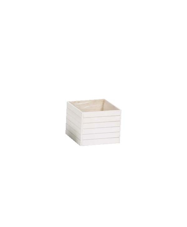 Descripció: Test quadrat de fusta blanc amb protector de plàstic interior. Test de Fusta de floristeria. Cub quadrat per a plantes. Ideal per a testos ES12cm.