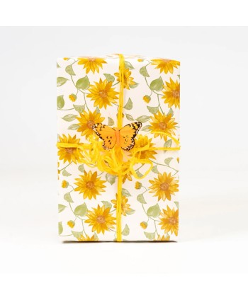 Descripció: Paper de regal Crema amb disseny GIRASOLS GROCS, A DOBLE CARA, amb cara interior en color SALMÓ. Embolcalls per al comerç i floristeria. Proveïdor Paper de Regal. Embolcalls per al comerç, floristeria, flors, plantes, lot de regals.