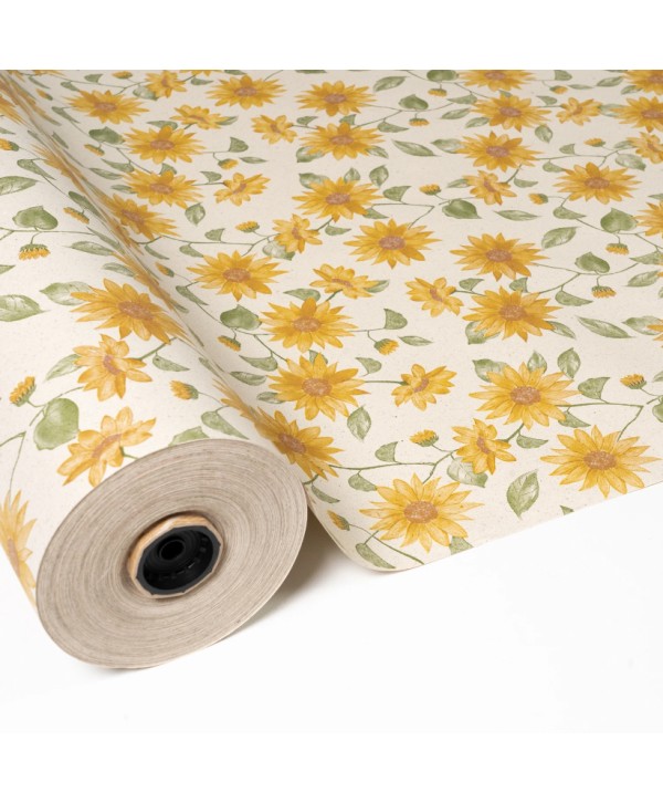 Bobina de paper de regal KRAFT RECICLAT AMB DISSENY DE GIRASOLS. Embolcalls per a plantes, rams i regals. Proveïdors majoristes per al comerç i floristeria.