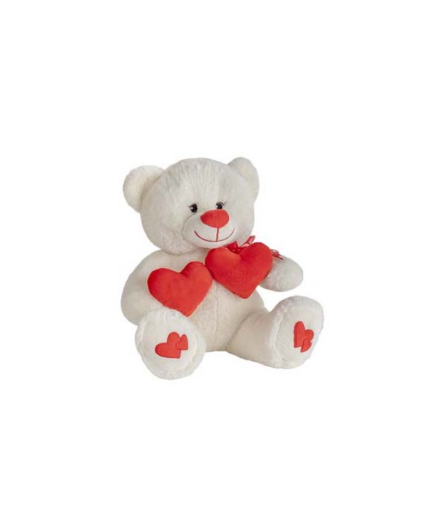 Osset Gran de peluix i vellut blanc amb Cor "TE QUIERO" i cors petits a les potes, nas marró. Proveïdor d'ossets i ninots de peluix per complementar cistelles de naixement, decoració d'Enamorats, Sant Valentí, Sant Jordi, Dia de la Mare. Preus només professionals.