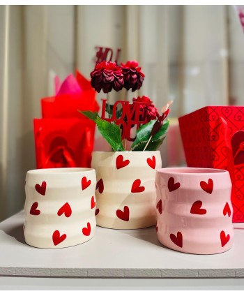 Elegant test de ceràmica crema amb cors vermells. Testos per complementar plantes de regals de Sant Valentí. Ideal per testos ES12cm.