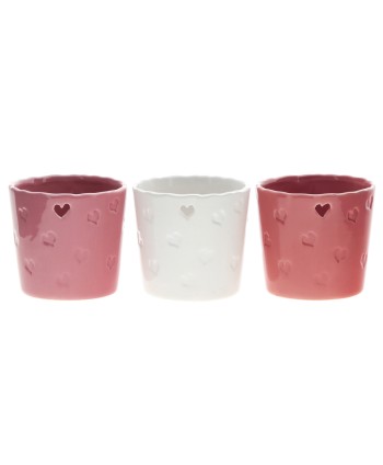 Descripció: Maceter rodó de ceràmica brillant amb cors amb relleu. Testos en tons blanc, rosa i vermell. Ideal per a una planta amb diàmetre de Ø12cm. (ES12cm.). Testos per complementar plantes en regals de Sant Valentí.