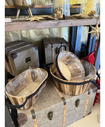 Test de fusta rodona cremada per a plantes o lots de Regals. Galleda de Fusta amb dues nanses de corda negra. Galleda de fusta rústic, barril, testos, contenidor d'alta qualitat. Proveïdors de complements per a floristeria i altres comerços. Proveïdors de testos de fusta natural.