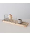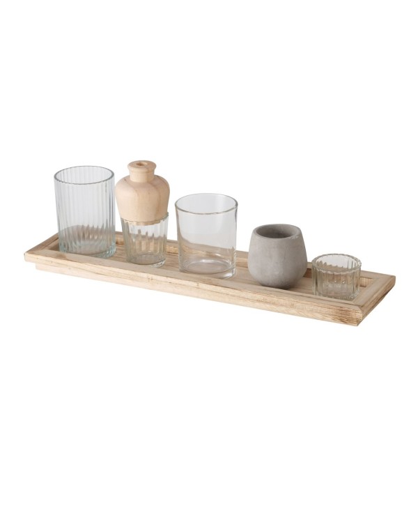 Descripció: Safata rectangular de fusta natural model NOLAN, amb un conjunt de gerros de vidre, fusta i ciment ideals. Conjunt molt original amb peces variades!