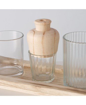 Safata rectangular de fusta natural model NOLAN, amb un conjunt de gerros de vidre, fusta i ciment ideals. Conjunt molt original amb peces variades!