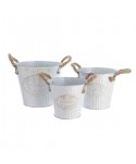 Joc de 3 jardineres ovalades blanques amb nansa de jute. Testos de zinc de colors primaverals. Proveïdors de Complements per a Floristeria i Comerç de decoració. Proveïdors de centres de zinc preciosos per a plantes.