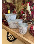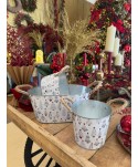 Descripció: Test o cub rodó de zinc blanc amb dues nanses de corda i relleu amb Arbres de Nadal. Ideal per a centres i lots de Nadal, Merry Christmas, decoració amb plantes poinsettia. Per test ES15cm.