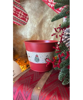 Descripció: Test rodó de zinc vermell amb relleu i disseny de Nadal en color crema i verd (arbre de Nadal i ninot de neu). Ideal per Nadal, Merry Christmas, decoració amb plantes.