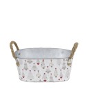Descripció: Jardinera oval de zinc blanc amb dues nanses de corda i relleu amb Arbres de Nadal. Ideal per a centres i lots de Nadal, Merry Christmas, decoració amb plantes poinsettia. Per a 2 tests ES16cm.