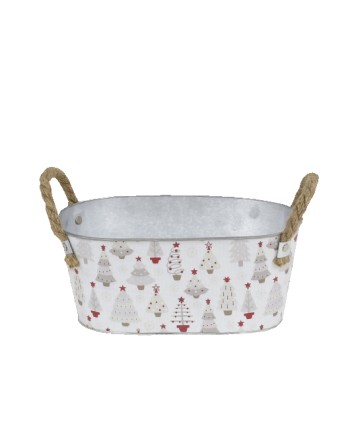 Jardinera oval de zinc blanc amb dues nanses de corda i relleu amb Arbres de Nadal. Ideal per a centres i lots de Nadal, Merry Christmas, decoració amb plantes poinsettia. Per a 2 tests ES16cm.