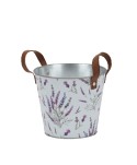 Descripció: Maceter de zinc decoratiu amb fulles de Lavanda i nanses de pell. Proveïdors de Complements per a Floristeria i Comerç de decoració. Proveïdors de centres de zinc per a plantes.