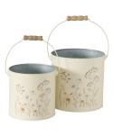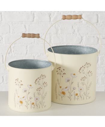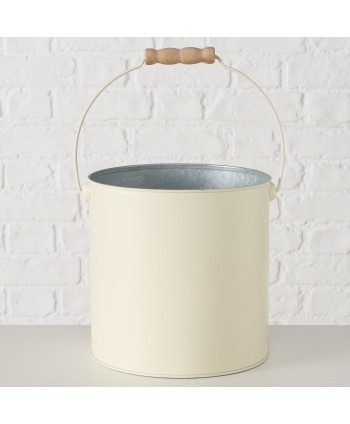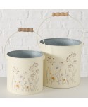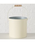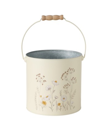 Descripció: Galleda o test de zinc rodó pintat a mà, amb disseny de flors sobre un fons crema mat i una nansa amb el mànec de fusta natural. Proveïdors de Complements per a Floristeria i Comerç de decoració. Proveïdors de centres de zinc per a plantes.