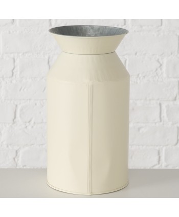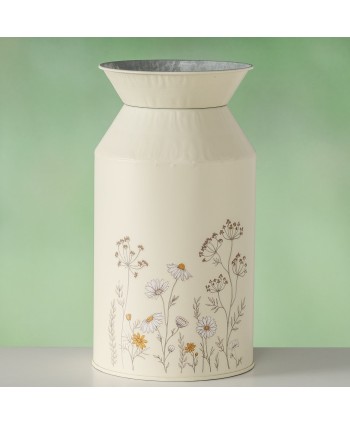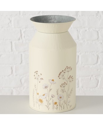 Gerro de zinc rodó pintat a mà, amb disseny en forma de lletera amb flors sobre un fons crema mat. Proveïdors de Complements per a Floristeria i Comerç de decoració. Proveïdor a l'engròs de centres de zinc per a plantes.
