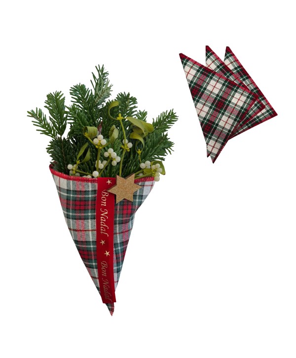 Cono de Linnete a cuadros escoceses rojos, verdes, blancos y oro para complementar el muérdago, los pétalos, el arroz... Complemento perfecto para el ramillete de la suerte de la colección de Navidad.