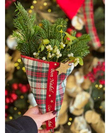 Descripción: Cono de Linnete a cuadros escoceses rojos, verdes, blancos y oro para complementar el muérdago, los pétalos, el arroz... Complemento perfecto para el ramillete de la suerte de la colección de Navidad.