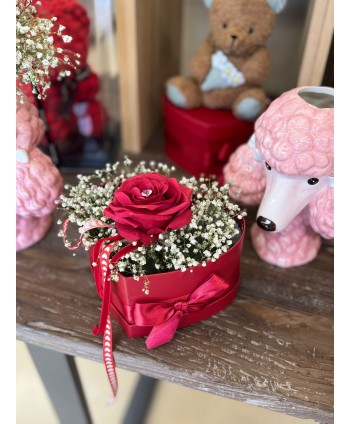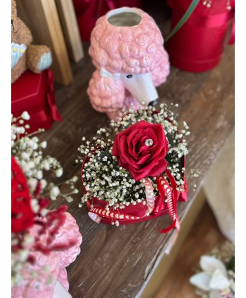 Descripción: Caja sombrero con forma de corazón y tapa de color rojo. Caja con relieve de rosas. Elegante Packaging para flores, plantas, ramo de novia. Con certificado FSC. Caja Sombrero de Kraft con cinta de algodón rojo.