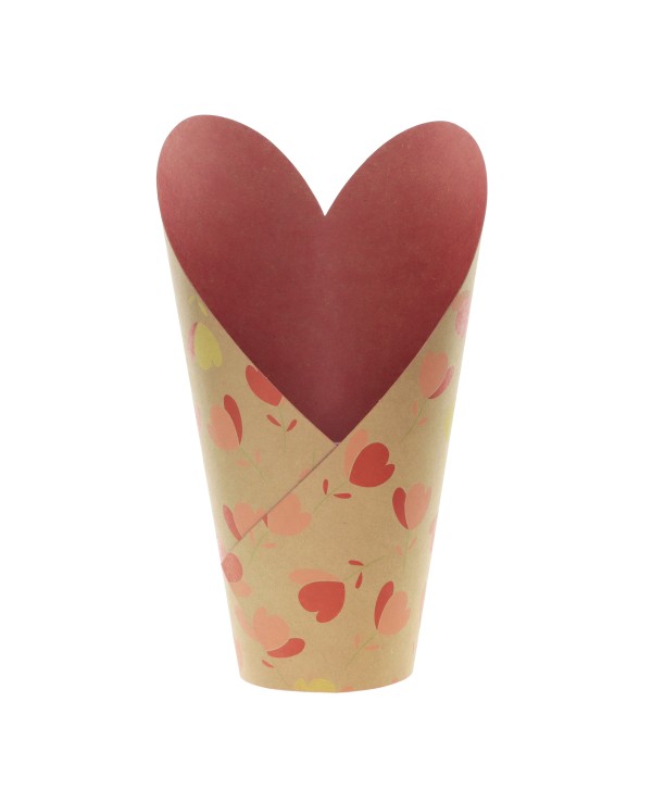 Maceta ecológica de papel Kraft FSC con forma de corazón. Envoltorios para flores y plantas en forma de corazón. Diseño maceta en forma de corazón en el interior de color rojo y impreso corazones pequeños.