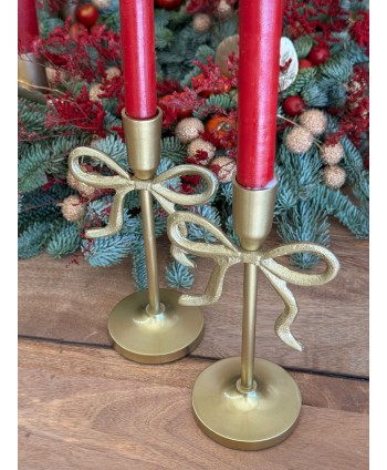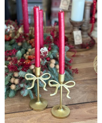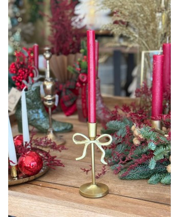 Elegante candelabro de metal con un lazo precioso y base redonda para una vela tipo cirio. Temática decoración Vintage con velas. Lazo como tendencia en decoración.