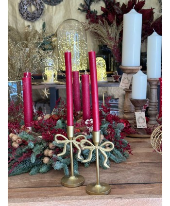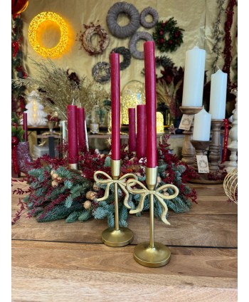 Descripción: Elegante candelabro de metal con un lazo precioso y base redonda para una vela tipo cirio. Temática decoración Vintage con velas. Lazo como tendencia en decoración.