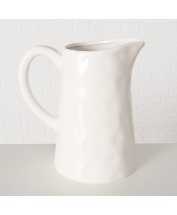 Jarra de cerámica JONAH hecha a mano, con asa, en tono blanco y decoración de rayas en relieve. Jarra apta para alimentos, se puede lavar en el lavavajillas. Ideal para las decoraciones más originales.