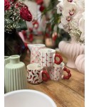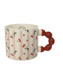 Descripción: Taza de cerámica CHERRY con asa de bolitas rojas, con el fondo blanco y decoración de rayas rosas y cerezas rojas. Ideal para las decoraciones más originales.
