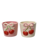 Descripción: Originales macetas de cerámica hechas a mano, con diseño de CEREZAS y lazos con puntitos. Macetas para decoración de bodas, eventos y composición floral. Macetas de Floristería.